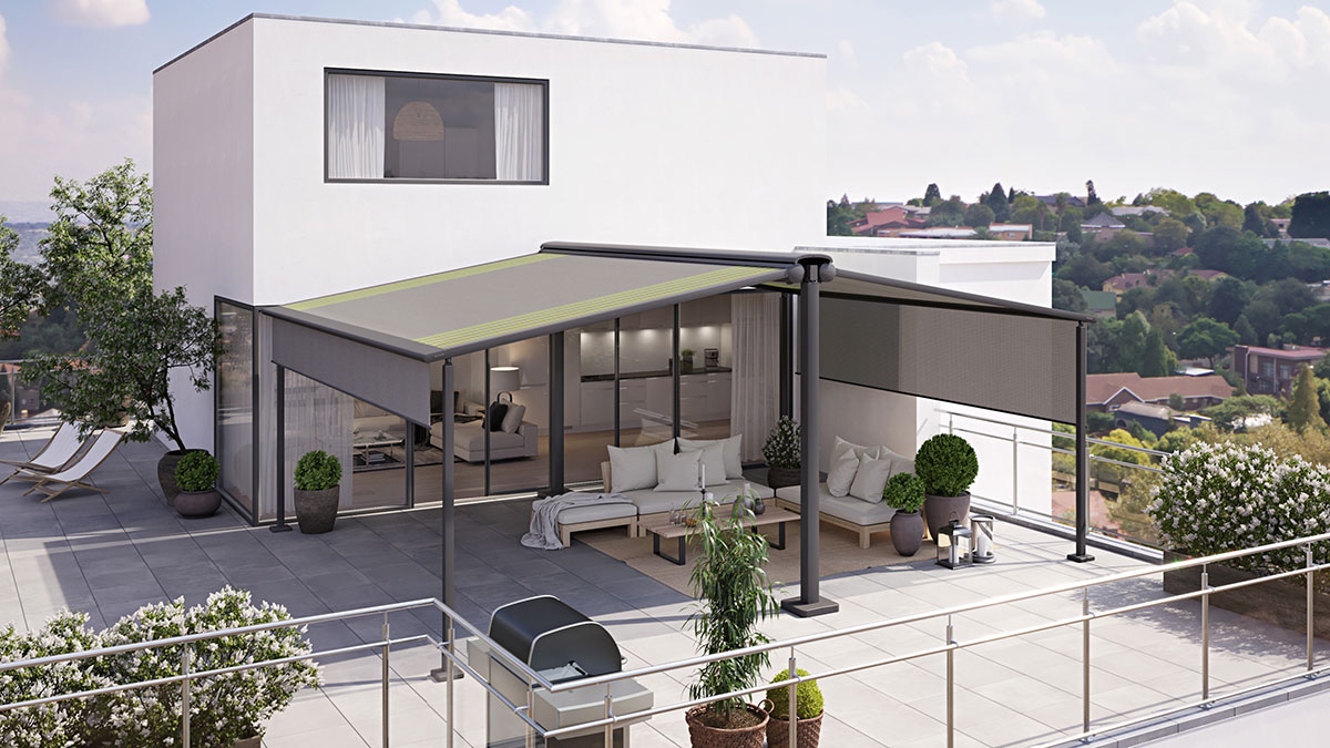 Die waagerecht ausfahrende Markise läuft bündig im Rahmen. Dies ermöglicht das tracfix System, welches das Tuch komplett fest umschließt. Dadurch bleibt die Markise im Markisendach markant windstabil bis Windstärke 6. Mit zusätzlichen Vertikalmarkisen sind Sie auch gegen Seitenwind oder tiefstehende Sonne rundum geschützt.
