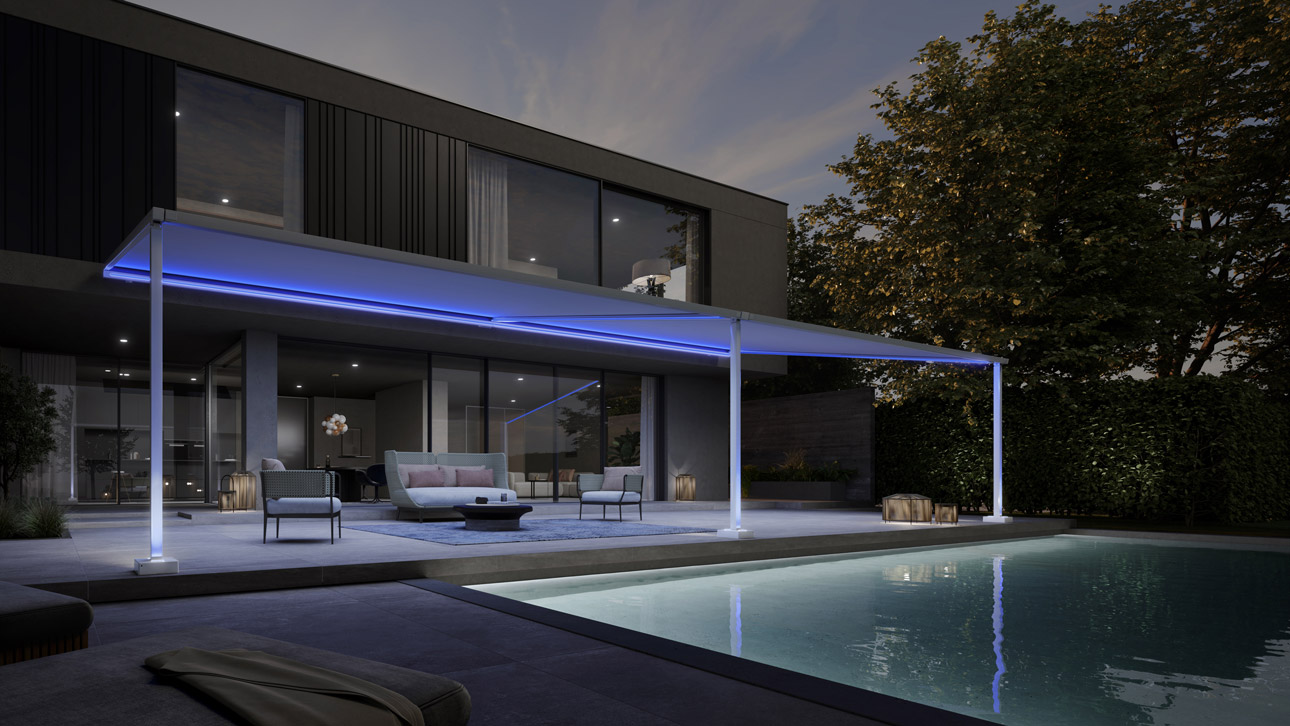 Die markilux pergola style wurde für Liebhaber klarer Formgebung mit viel Komfort konzipiert. Das durchgehend eckige Design steht im Mittelpunkt und verleiht diesem Sonnenschutzsystem eine moderne Leichtigkeit. Die puristische Gestaltung kommt besonders am Abend zur Geltung: Die perfekt integrierte LED-Beleuchtung verwandelt den Terrassenbereich in ein individuelles Lichtambiente nach Ihren Wünschen.