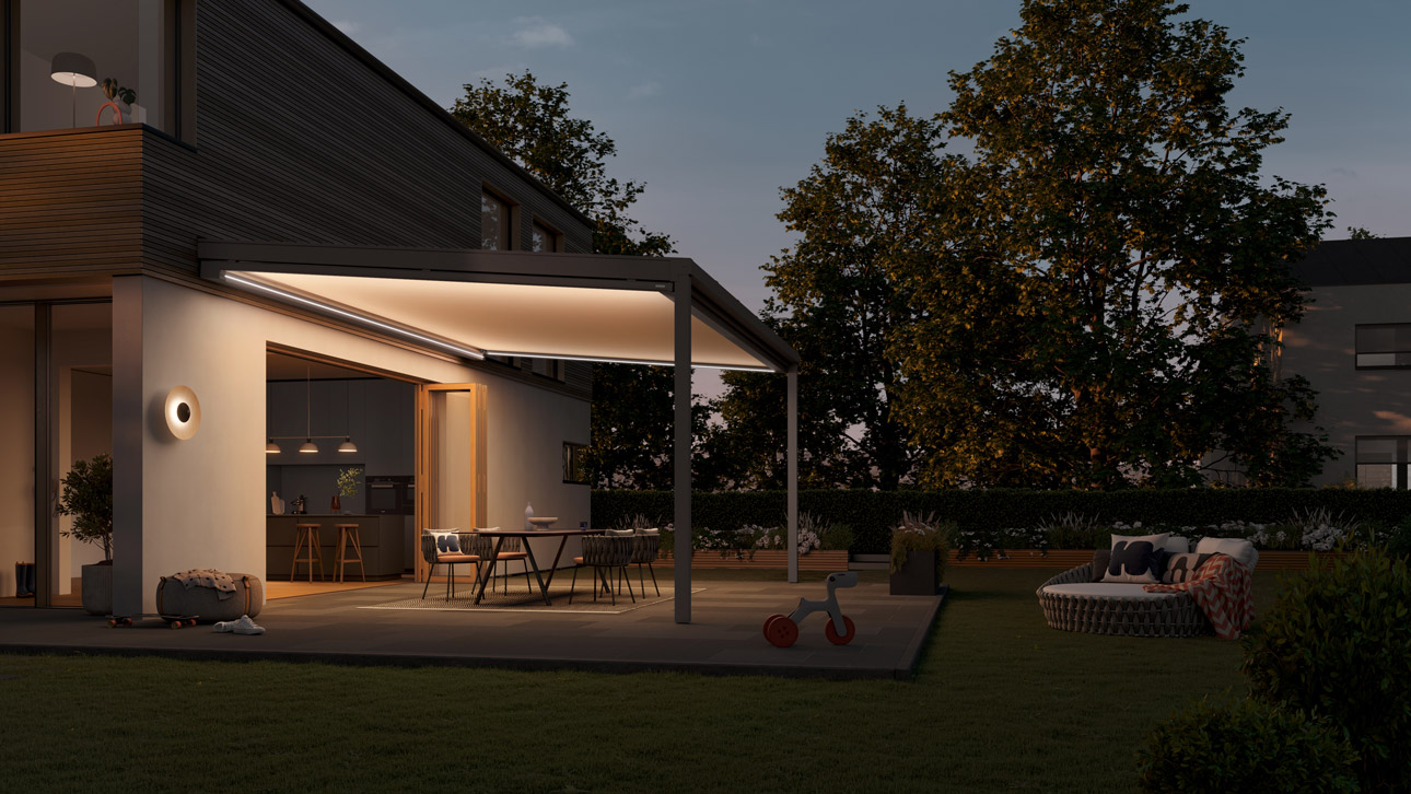 Die markilux 679 vereint elegant klare Linienführung mit dem Terrassendach und schafft eine harmonische Einheit. Sie ist nicht nur eine Lichtquelle für die überdachte Terrasse, sondern auch eine Bereicherung für das Leben im Freien. Tagsüber dient sie als zuverlässiger Sonnenschutz und am Abend präsentiert sie sich in vollem Glanz. Die farbigen oder warmweißen LED-Lines sind nahtlos in die Kassette und die Führungsschienen integriert und lassen sich intuitiv per App steuern.